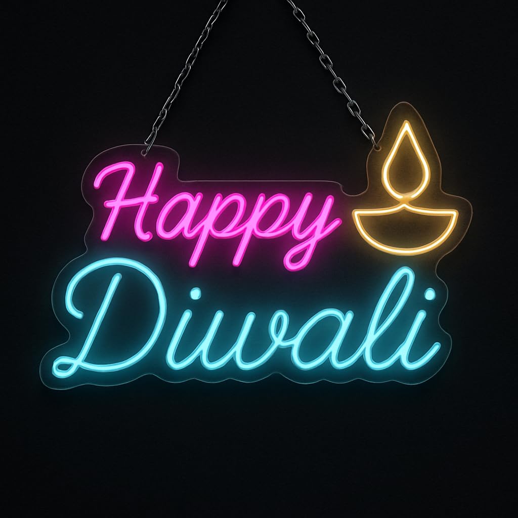 A neon Diwali sign creates a warm, inviting, and wonderfully festive atmosphere. Whether you want a simple, elegant neon light happy Diwali text or a striking graphic, this décor adds personality and a contemporary flair to any space. Use this bright, colorful sign to highlight a special area, such as a gift display or a festive sweets table. Illuminate your celebrations with the unmistakable modern style of LED neon.
