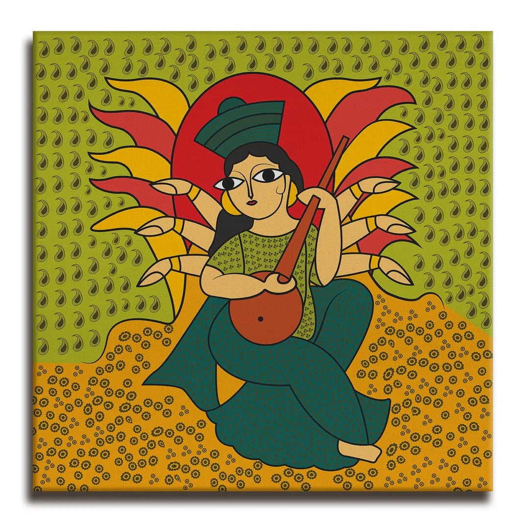 Ma Saraswati, Kalighat Art, Framed Abstract Canvas Wall Art for Bedroom